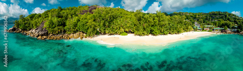 Panorama of Paradise Sunny beach with palms and turquoise sea. Summer vacation and tropical beach concept. Seyshelles, Anse Solei