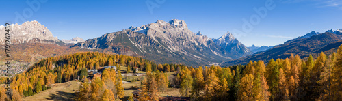 Panorama of the Dolomites mountains during autumn sunrise. Beautiful mountians of Alpi Dolomiti in Italy, South Tirol