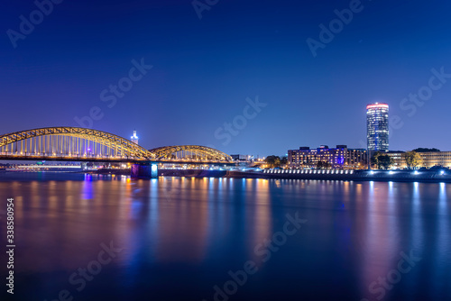 Panorama of the Hohenzollern Bridge over the Rhine River and Cologne Cathedral by night, Cologne city skyline Germany,Skyline von Köln mit Kölner Dom und Hohenzollernbrücke bei Nacht.