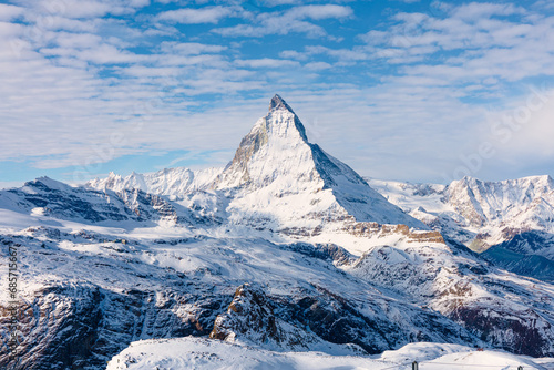 Panorama of the Mighty Matterhorn and surrounding mountains covered in snow on a cold sunny winter morning