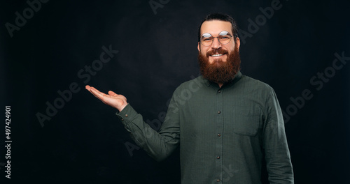 Panorama photo of a bearded man holding hand up over black background. Studio shot.