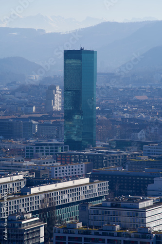Panorama view of city of Zurich, Switzerland, with skyscraper prime tower in the middle.