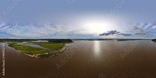 Panorama, Village, Aerial, River, hills, Cliff, islands, bridge, sun, specular, reflection