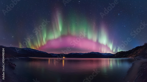 Panorama with northern lights in night starry sky against background of mountains and lakes. generative ai illustration. Aurora. Illustration