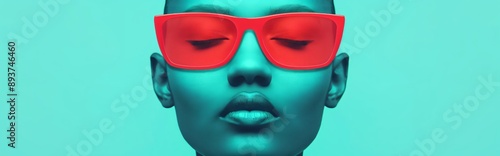 Panoramic banner with a young woman in red sunglasses poses elegantly against a turquoise backdrop, exuding modern glamour and trendy style