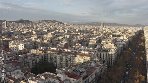 Panoramic bird's-eye view of Barcelona. Drone movement from residential areas to the Sagrada Familia Cathedral