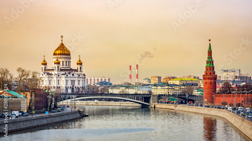Panoramic cityscape with beautiful Cathedral of Christ the Saviour and Kremlin Vodovzvodnaya Tower view from Moskva River golden sunrise Moscow Russia