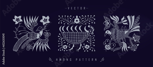 Panoramic illustration of Hmong patterns with different birds on a dark blue background