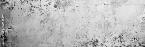 Panoramic image of a distressed white concrete wall, showcasing a grunge texture suitable for backgrounds or graphic design elements with its weathered and aged surface