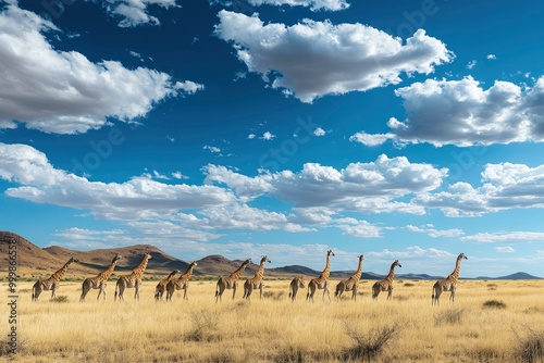 Panoramic landscape with a group of giraffes in Kalahari Desert, Namibia. Herd of giraffe pastured in savanna, wild African animals in natural habitat, generative ai