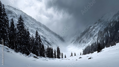 Panoramic photo of remote alpine valley hit sudden avalanche thick snow cloud rushing downhill pine tree buried extreme winter landscape overcast sky background