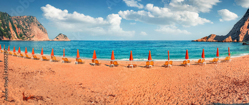 Panoramic spring view of Petani Beach with red ambrellas. Marvelous morning scene of Cephalonia Island, Greece, Europe. Beautiful seascape of Mediterranen Sea. Bright outdoor scene of Ionian Islands.