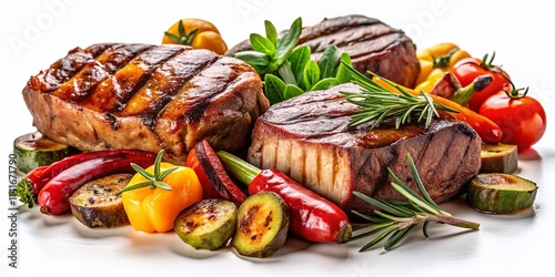 Panoramic Succulent Grilled Steak Cubes & Veggies - White Background