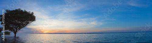 Panoramic sunset reflection in a lake.