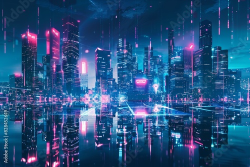 Panoramic urban architecture cityscape with space and neon light effects. Modern hi-tech science futuristic technology concept. Abstract digital high-tech city design for banner background