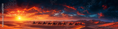 panoramic view, camels walking in desert, beautiful sunrise or sunset. Fantasy Wall Art Poster Print Design for Home Decor, Decoration Artwork, Wallpaper & Background for Computer