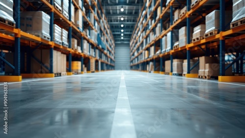 Panoramic view of a cavernous warehouse with empty shelves and support columns.