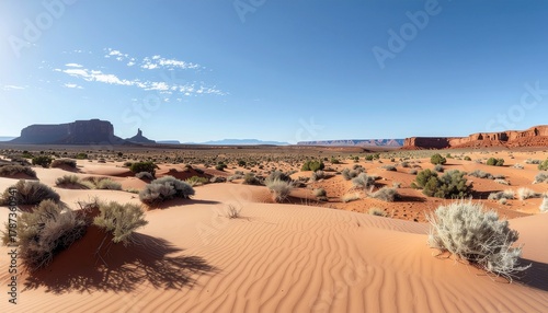 Panoramic view of a desert landscape featuring mesas, sand dunes, and sparse vegetation
