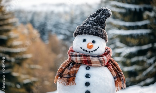 Panoramic view of a happy snowman in a winter retreat with space for copying