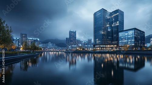 Panoramic view of a modern city at night urban landscape architectural marvels serene water reflection stunning imagery