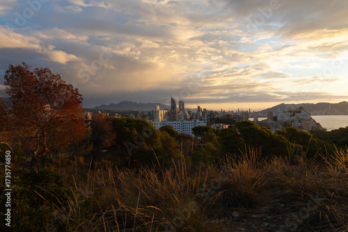 Panoramic view of a modern coastal city with high-rise buildings along the Mediterranean Sea.