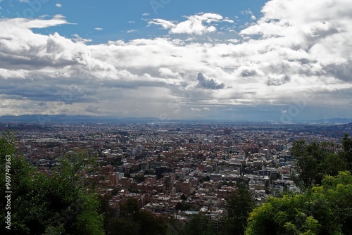 Panoramic view of a sprawling cityscape of Bogota with a mix of buildings under a partly cloudy sky