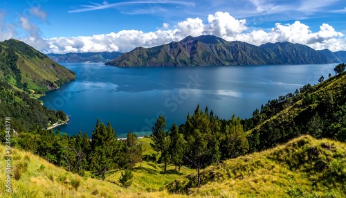 Panoramic view of a tranquil lake nestled amongst towering mountains, showcasing lush green hills and a vibrant blue water body, a serene and captivating landscape.