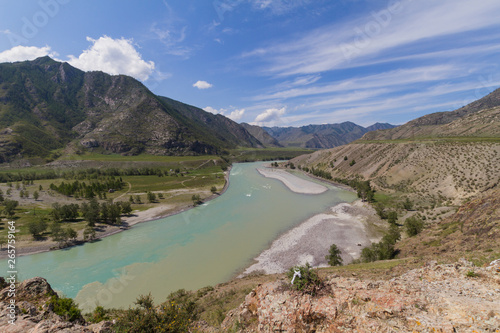 Panoramic view of an Altai mountain Katun river. Place of confluence of Katun and Chuya rivers. Summer time.