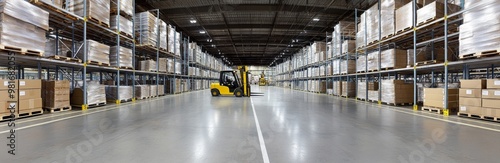 Panoramic view of an empty warehouse featuring high shelves filled with boxes and pallets, with forklifts moving goods in a concrete gray setting highlighted by soft overhead lighting and a splash of