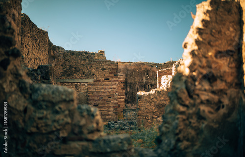 Panoramic view of ancient streets and Roman ruins in Pompeii, Italy, with stone columns and frescoed walls, ideal for travel, history, and documentary projects