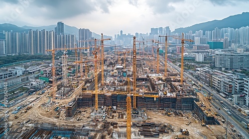 Panoramic view of construction sites and many cranes working in a new construction business : Generative AI