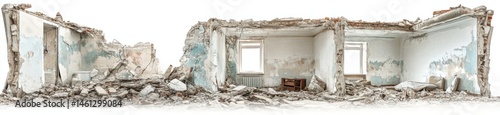 Panoramic View of Destroyed Building Ruins with White and Light Blue Walls