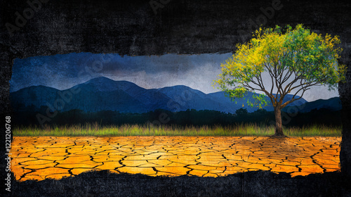 panoramic view of drought stricken landscape with cracked earth and solitary tree. scene conveys sense of desolation and impact of climate change