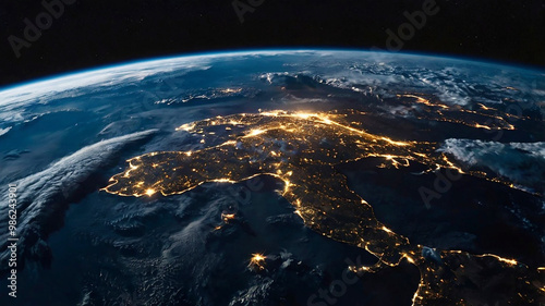 Panoramic view of Earth from space glowing city lights, light clouds, and the vibrant curve of the globe