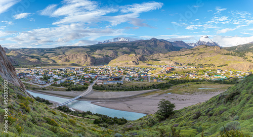panoramic view of el chalten town and fitz roy peak at background, argentina