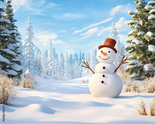 Panoramic view of happy snowman in winter, Cheerful Snowman Surrounded by Sparkling Snowy Terrain and Evergreen Trees Under a Bright Winter Sky Enhancing the Joyful Holiday Spirit