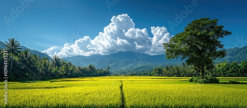 Panoramic view of lush rice field under vibrant blue sky with clouds and mountains in the background showcasing natural beauty and tranquility
