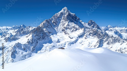 Panoramic View of Majestic Snow Covered Mountain Peak Under a Clear Blue Sky