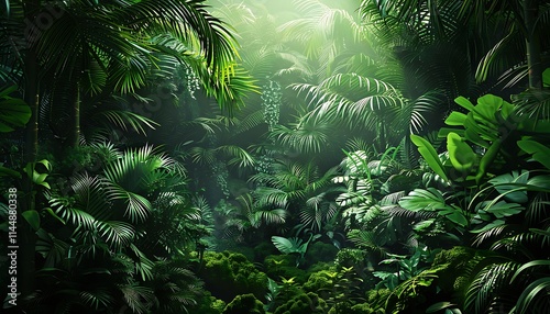 Panoramic view of misty and foggy tropical forest.