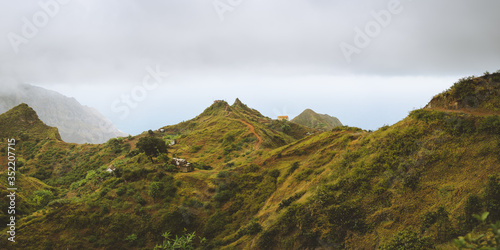 Panoramic view of mountain range of Ribeira de Janela on Santo Antao Cape Verde. Beautiful landscape with hiking trail leading along small village