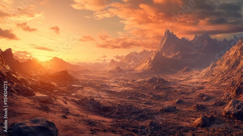 Panoramic view of rocky hillside at sunrise in mountains showcasing vibrant sky and tranquil barren landscape.