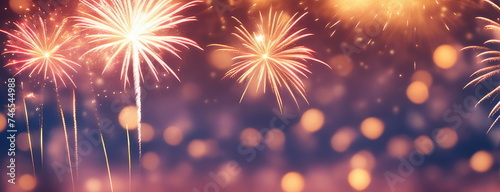 Panoramic View of Sparkling Fireworks and Bokeh Lights