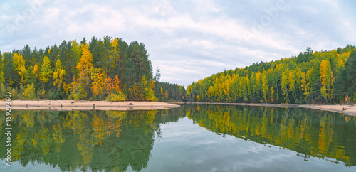 Panoramic view of the bright colorful trees along the bank of the Kama River Russia Perm Krai. Autumn colored trees and blue sky, reflected in the calm and shiny water.
