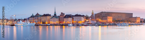 Panoramic view of the old town city waterfront at sunset, Stockholm, Sweden