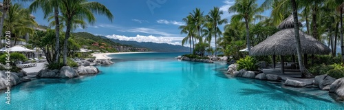 Panoramic view of the pool and beach area at a resort on the West Coast, overlooking the Black Rocks mountain range with lush palm trees and a blue sky