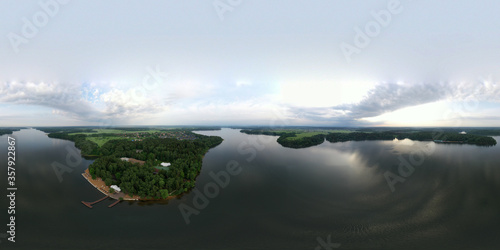 panoramic view of the river with floating boats and beautiful clouds shot from a drone