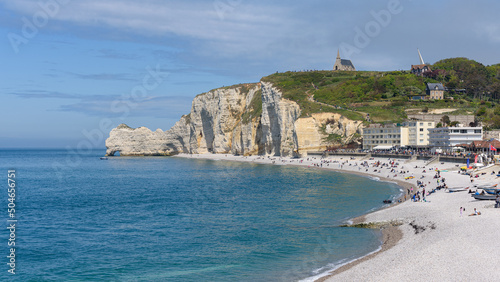 Panoramic view of the white chalk cliffs of Etretat in Normandy (France).