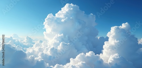 Panoramic view of white fluffy clouds in blue sky on sunny day. Natural background, heaven, atmosphere. Cloudscape, weather, nature concept for travel, vacation, tourism, inspiration.