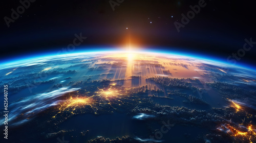 Panoramic view on planet Earth globe from space. Glowing city lights, light clouds. Generative AI
