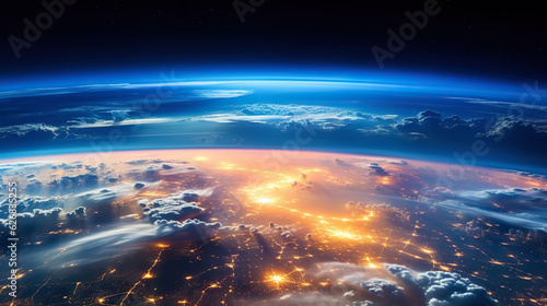 Panoramic view on planet Earth globe from space. Glowing city lights, light clouds. Generative AI